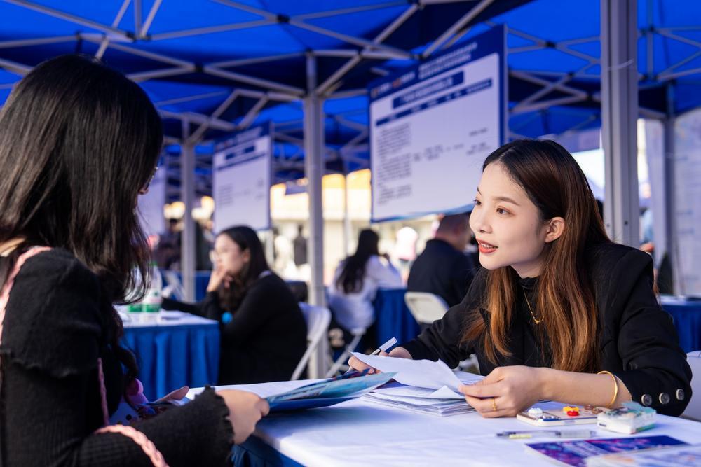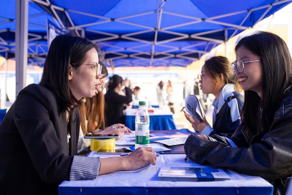 (10月29日,在安博在线注册天健体育场,企业招聘人员(左)向求职学生介绍岗位信息。)